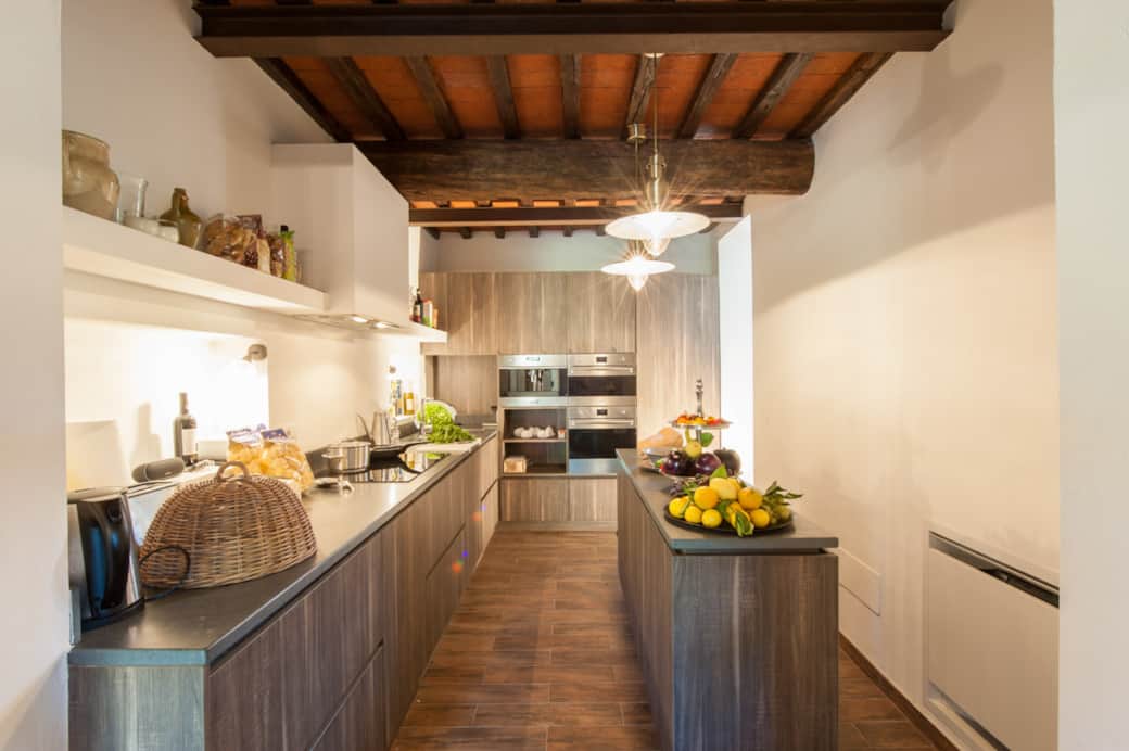 The interiors of Villa Lucente combine modern sophistication with classic Tuscan charm, blending contemporary design elements with rustic textures for a timeless, welcoming feel. A neutral palette of soft greys and beiges, accented by natural wood and elegant finishes, creates an atmosphere of calm and understated luxury.