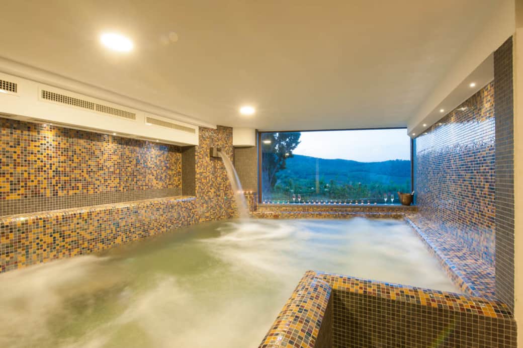 Enjoy a heated indoor pool finished with mosaic tiles, complete with hydro-jets, waterfalls, and a panoramic windowoverlooking the vineyards — plus a convenient shower area.
